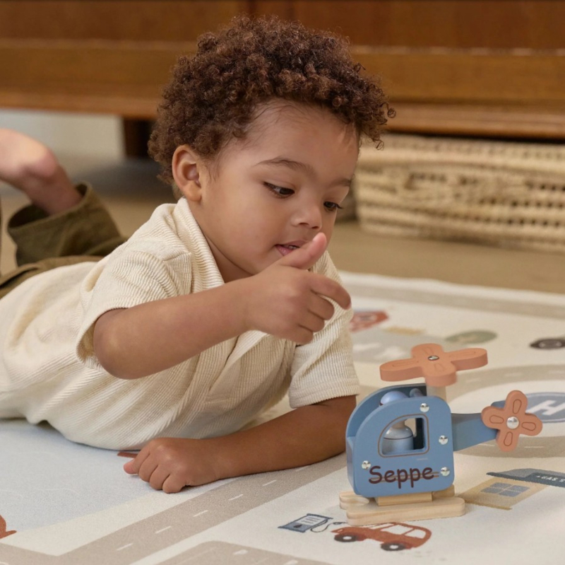 Wij graveren de naam enkelzijdig in de helikopter, op deze manier kan je kindje er veilig mee spelen en ontdekken.