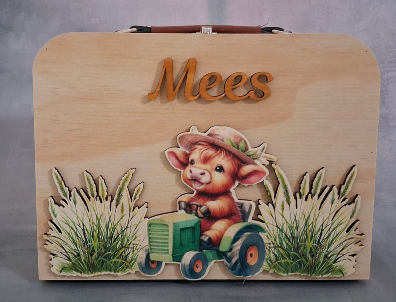 Daarnaast is de deksel van de koffer met een leuke 2D afbeelding (zoals afgebeeld staat op foto nr.4) tevens plaatsen zij de naam van de Little Farmer in 2D op de koffer.