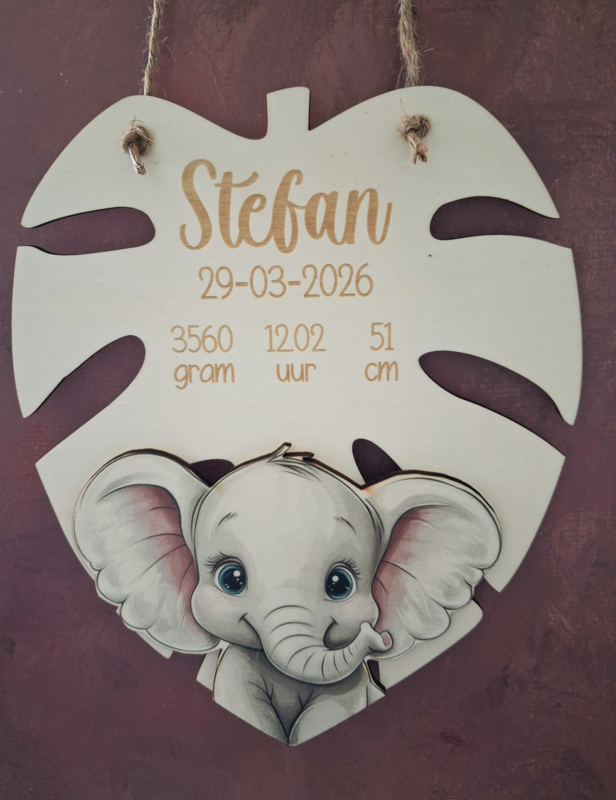 Artikelnummer: 3920 OverzichtHoe gaaf is dit geboortebord in de vorm van een blad met een schattige Olifant?!