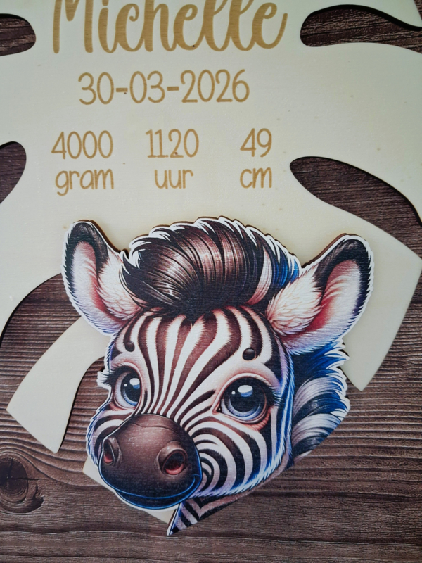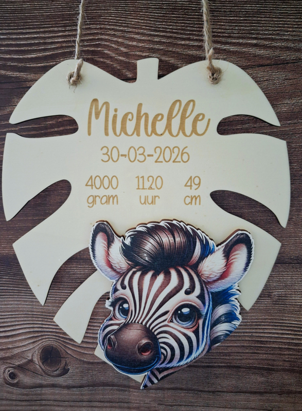 Artikelnummer: 3921 OverzichtHoe gaaf is dit geboortebord in de vorm van een blad met een lieve Zebra?!