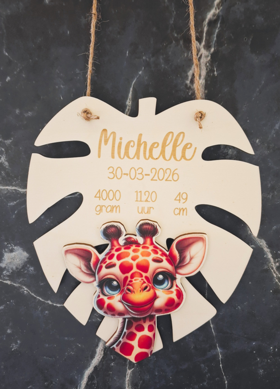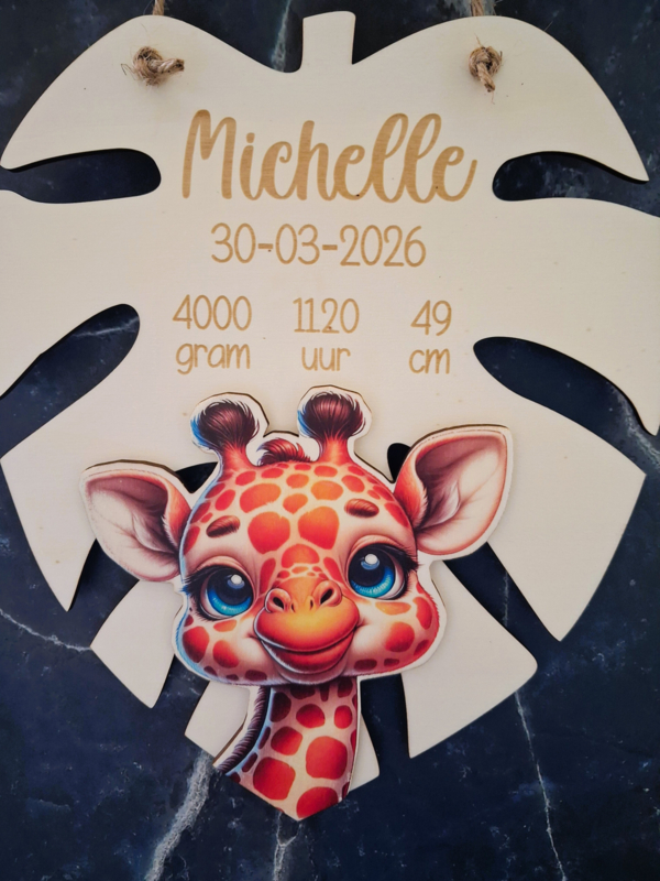 Artikelnummer: 3923 OverzichtHoe gaaf is dit geboortebord in de vorm van een blad met een vrolijke Giraf?!