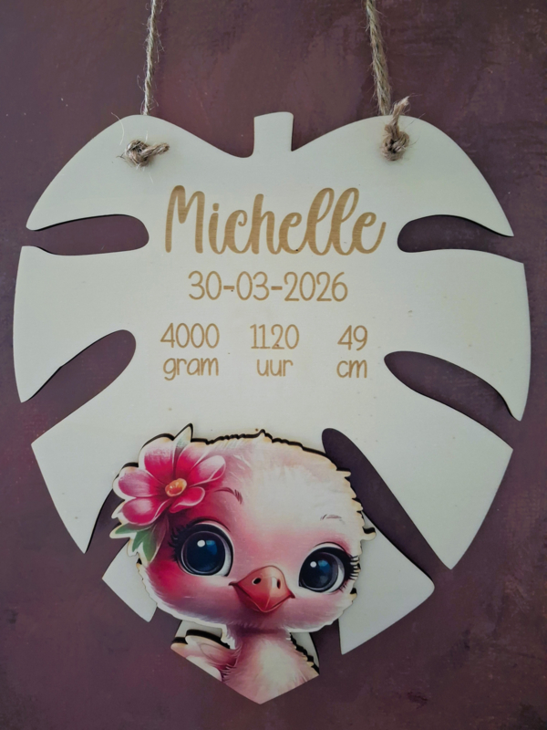 Artikelnummer: 3923 OverzichtHoe gaaf is dit geboortebord in de vorm van een blad met deze schattige baby flamingo?!