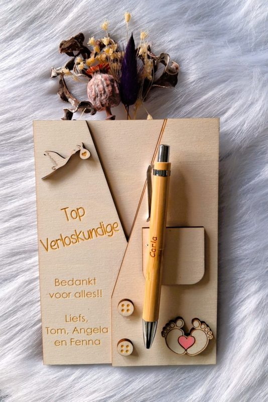 Houten 3D kaart Top Verloskundige met Bamboo pen voorzien van naam