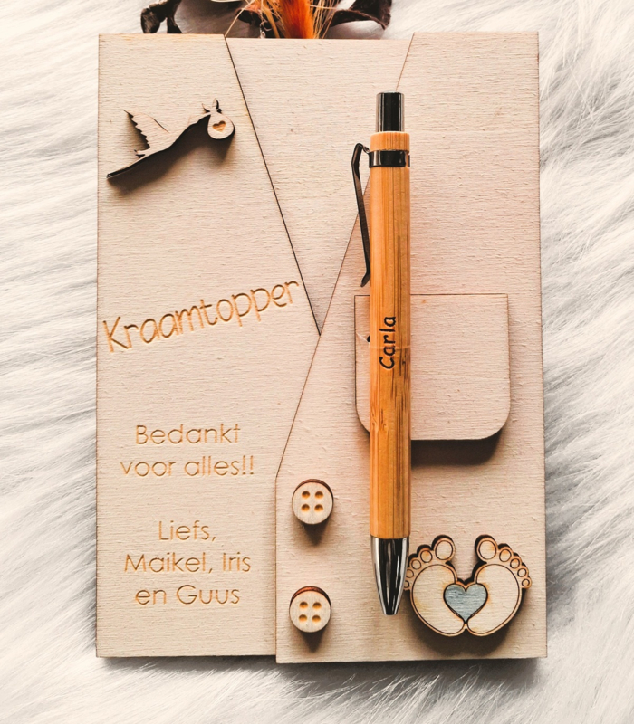 Houten 3D kaart Kraamtopper met Bamboo pen voorzien van naam
