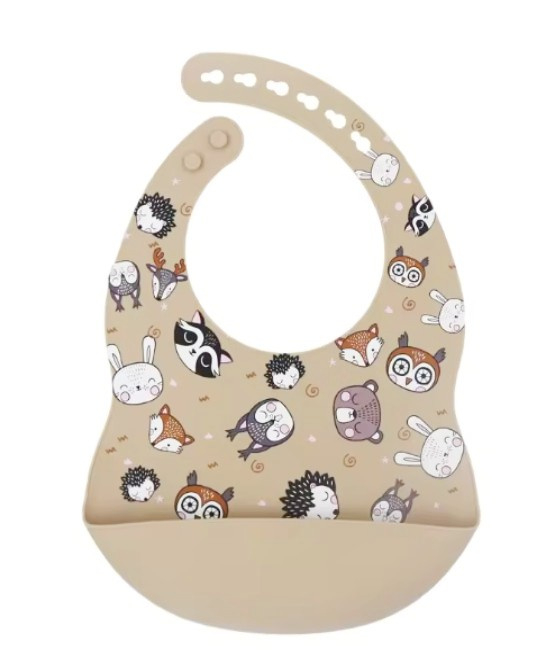- Siliconen slab voorzien van all over bosdieren print en een handig opvangbakje in de kleur creme