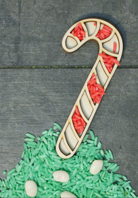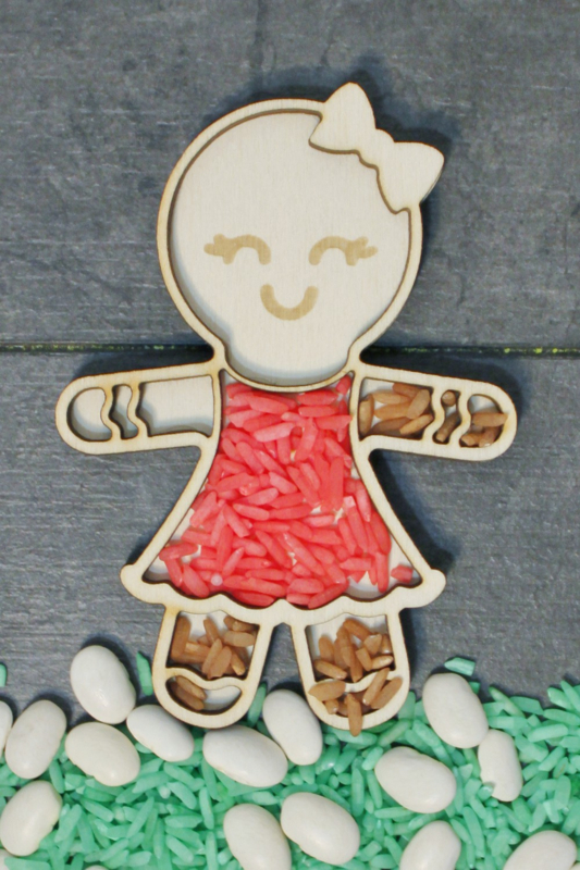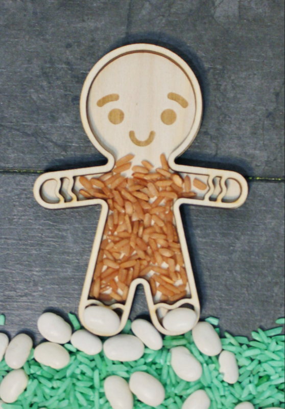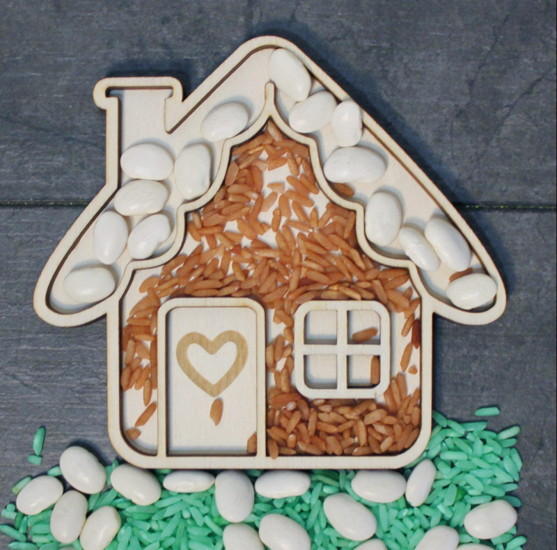De houten vormen kunnen gevuld worden met speelrijst, bonen, mais en nog veel meer.