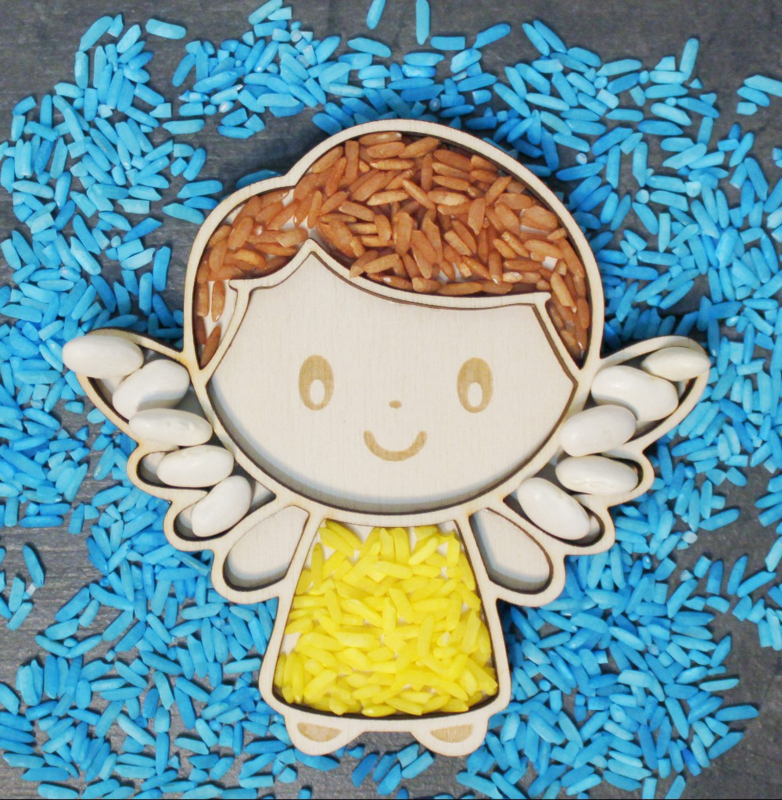 De houten vorm kan gevuld worden met speelrijst, bonen, mais en nog veel meer.